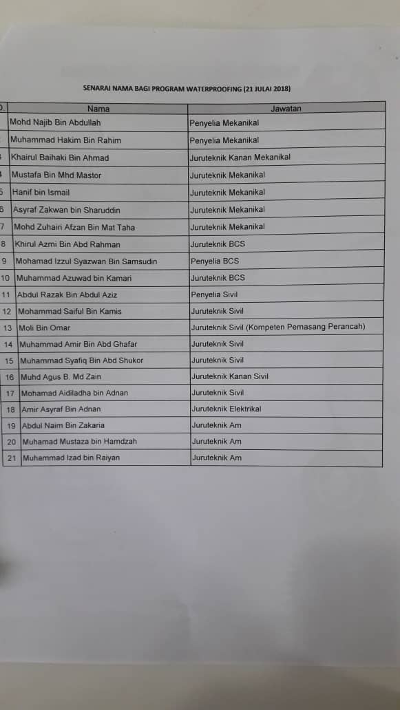 | Peserta | 1. Mohd Najib Abdullah (Penyelia Mekanikal) |